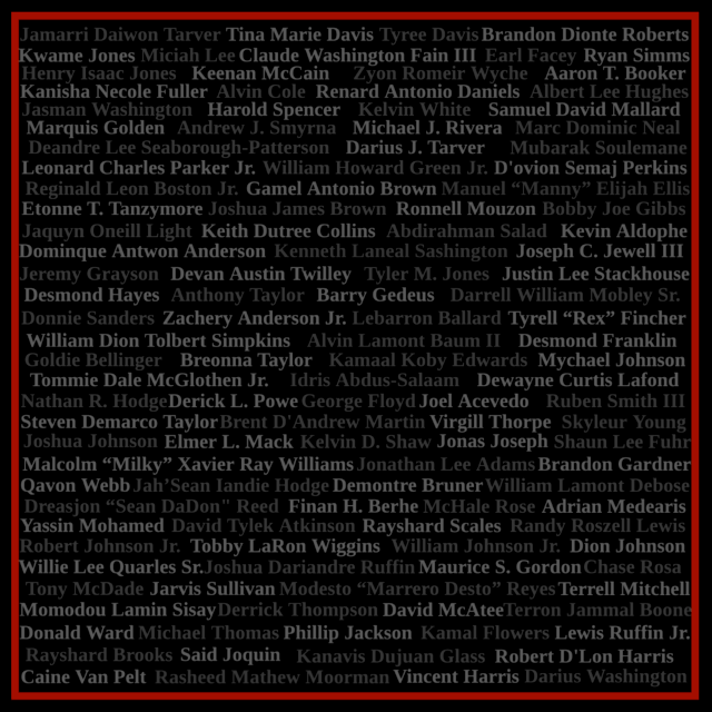 January. 2020. Jamarri Tarver, 26, Las Vegas, NV. Tyree Davis, 25, Chicago, IL. Tina Marie Davis, 53, Spring Valley, NY.Brandon Dionte Roberts, 27, Milford, DE. Kwame Jones, 17, Jacksonville, FL. Miciah Lee, 18, Sparks, NV. Claude Washington Fain III, 47, Philadelphia, PA. Earl Facey, 37, New York, NY. Henry Isaac Jones, 47, Bainbridge, GA. Ryan Simms, 49, Miami Beach, FL. Keenan McCain, 29, Gary, IN. Albert Lee Hughes, 47, Lawrenceville, GA. Renard Antonio Daniels, 55, Cocoa, FL. Mubarak Soulemane, 19, West Haven, CT. Samuel David Mallard, 19, Powder Springs, GA. Kelvin White, 42, Chesapeake, VA. Gamel Antonio Brown, 30, Owings Mills, MD. Darius J. Tarver, 23, Denton, TX. Reginald Leon Boston Jr., 20, Jacksonville, FL. Michael J. Rivera, 32, Bloomingdale, NJ. Andrew J. Smyrna, 32, Atlanta, GA. Deandre Lee Seaborough-Patterson, 22, Savannah, GA. Marquis Golden, 29, St. Petersburg, FL. Joshua James Brown, 34, Columbus, OH. D’ovion Semaj Perkins, 19, Aurora, CO. William Howard Green Jr., 43, Marlow Heights, MD. Jaquyn O’Neill Light, 20, Graham, NC. Keith Dutree Collins, 52, Raleigh, NC. Abdirahman Salad, 15, Columbus, OH.