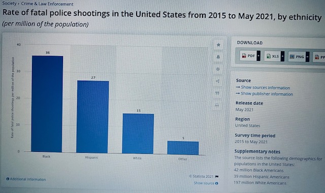 Generally, Black people, based on Mapping Police Violence data, are three times more likely to be killed by the police and 1.3 times more likely to be unarmed than the White people: 17% of unarmed Blacks, 13% of Whites, and 14.5% of unarmed Hispanics were killed by the police between 2013 and 2020. Unfortunately, the trend of fatal police shootings, as Statista Department Research suggests, is on increase—totaling at 213 Americans killed only in the first three months of 2021, 30 of whom were Black. Based on the Mapping Police Violence updated list, the police killed 352 people in 2021—in a rate similar to the past years—with only three days without having killed someone.