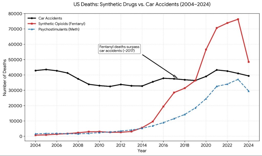 Figure 1. Line Chart Comparing U.S. Deaths From Synthetic Opioids (Fentanyl), Psychostimulants (Methamphetamine), And Car Accidents From 2004 to 2024. CDC National Center for Health Statistics (NCHS) and NHTSA Traffic Safety Facts. 2024.